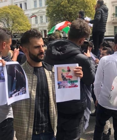 Demonstration in front of the Iranian Embassy against the Iranian government, protesting state violence, repression, and the treatment of political opponents.